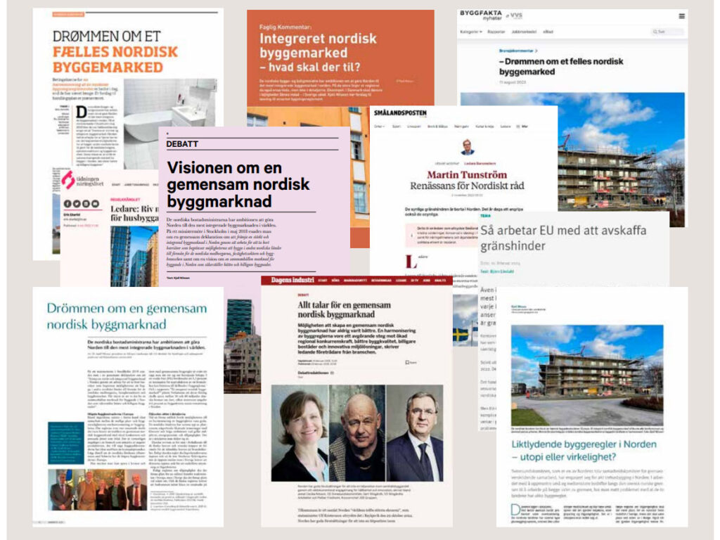 I samband med seminariet ”Harmonisation of Nordic Building Regulations” i Oslo 23 mars 2023, anlitades dr. Kjell Nilsson ( Tidigare direktör på NordRegio), som expert. Kjell fick i uppdrag att analysera gränshindret och skriva en artikel som presenterar problematiken men också lösningen på hur Norden kan få till gemensamma byggregler. Artikeln skickades ut till en rad olika tidningar och ledde till elva publiceringar under 2023 och 2024, i fyra länder: Sverige, Norge, Finland och Danmark. Bland annat i Byggfakta, Komunal Teknikk, Stadsbyggnad, Arbeidsliv i Norden och Tidningen Näringslivet.